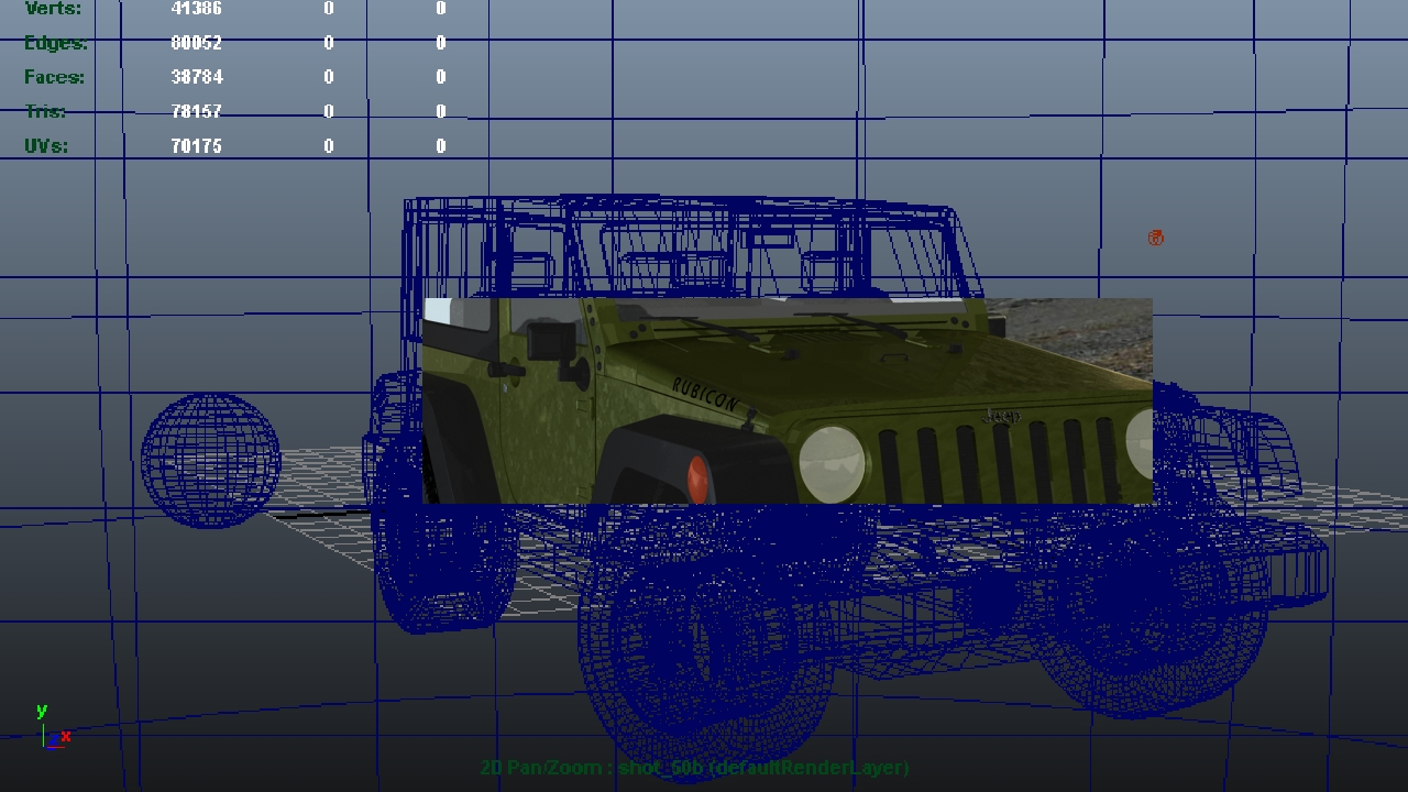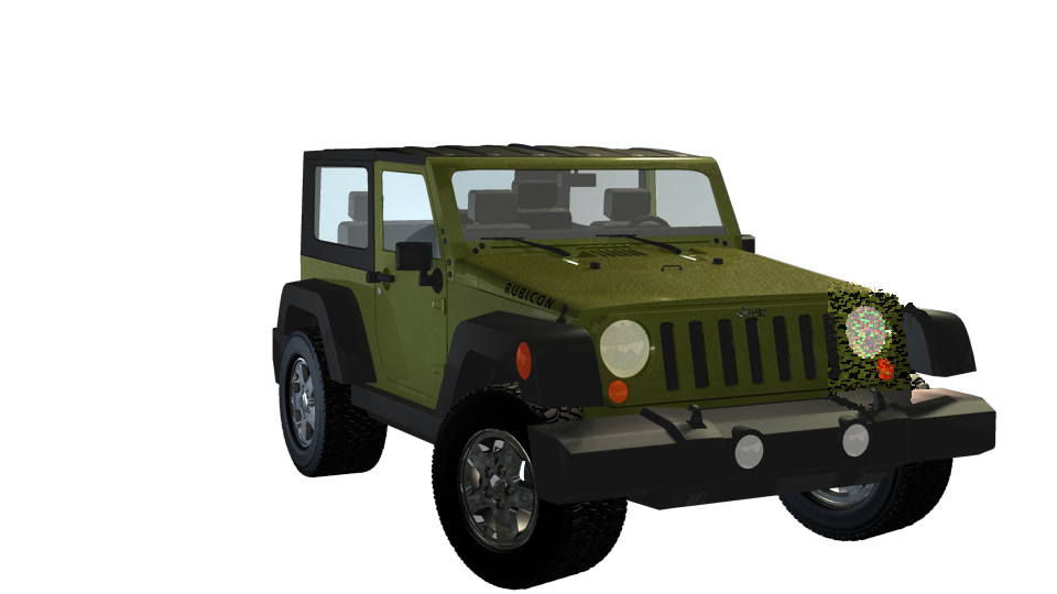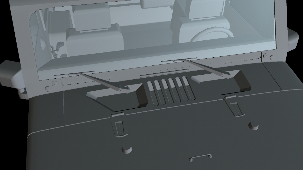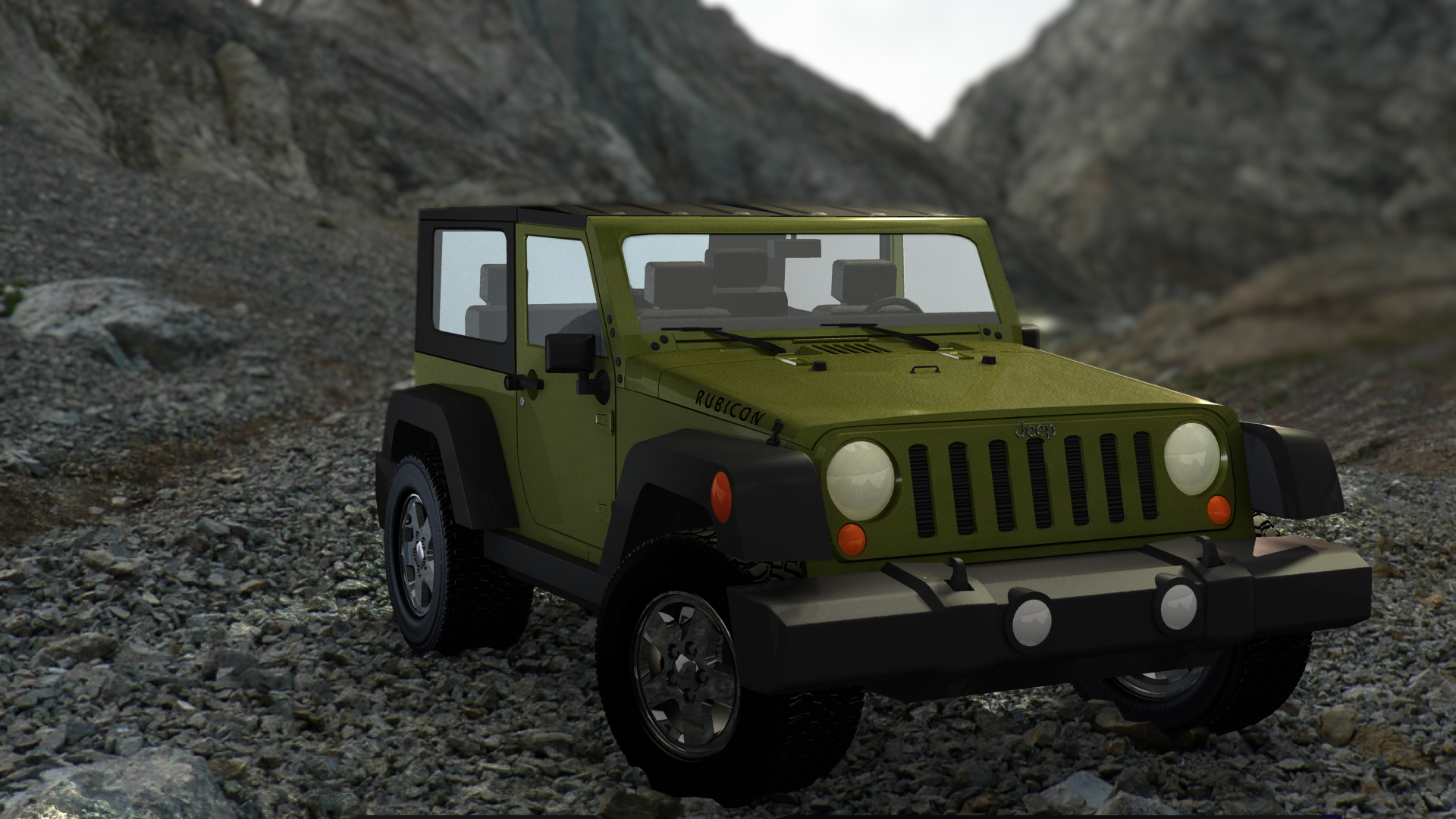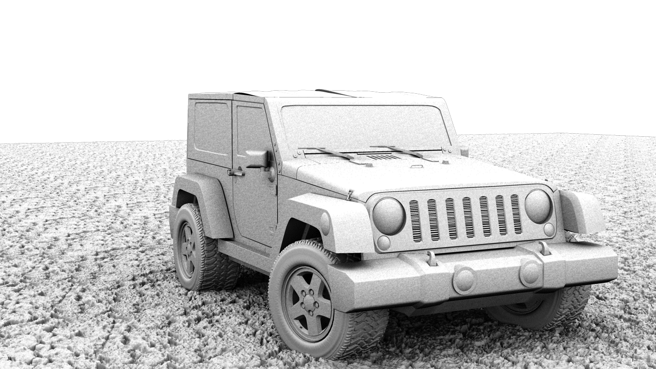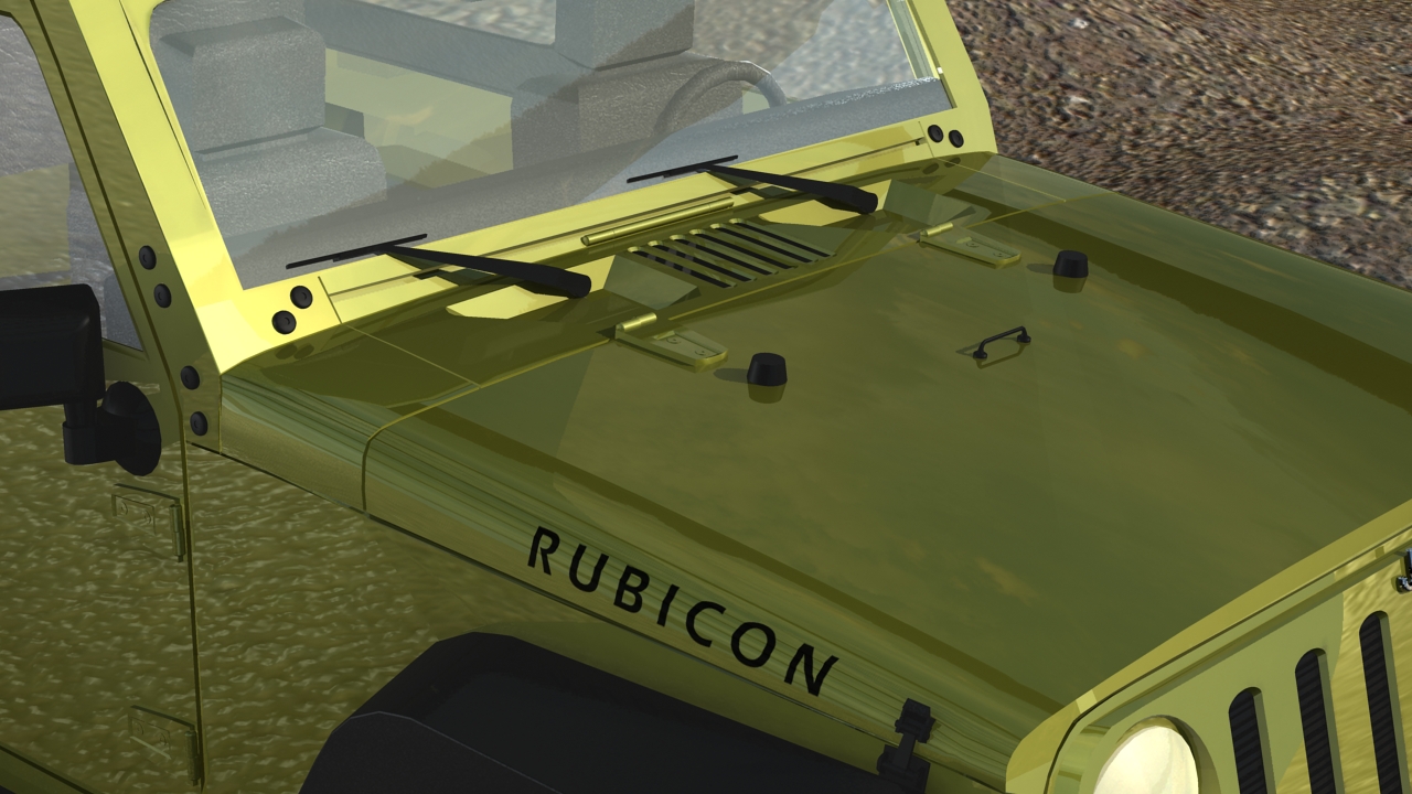 The “Rubicon” label on the vehicle’s hood. This was trickier to achieve and required a more complicated layered shader to show the car paint material underneath the text, which was created in Photoshop.