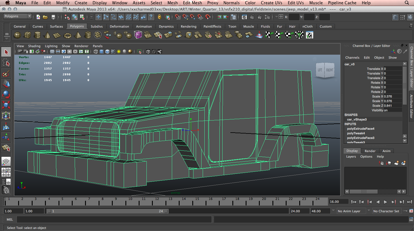 The early stages of modeling are already proving to be somewhat difficult for me. Having little experience with Maya and modeling, I have yet to attempt a model as complex as a vehicle – until now! I have already scrapped my model and redone it many, many times, as I am quickly learning about things that are helpful, and things that may get my model into trouble down the road.