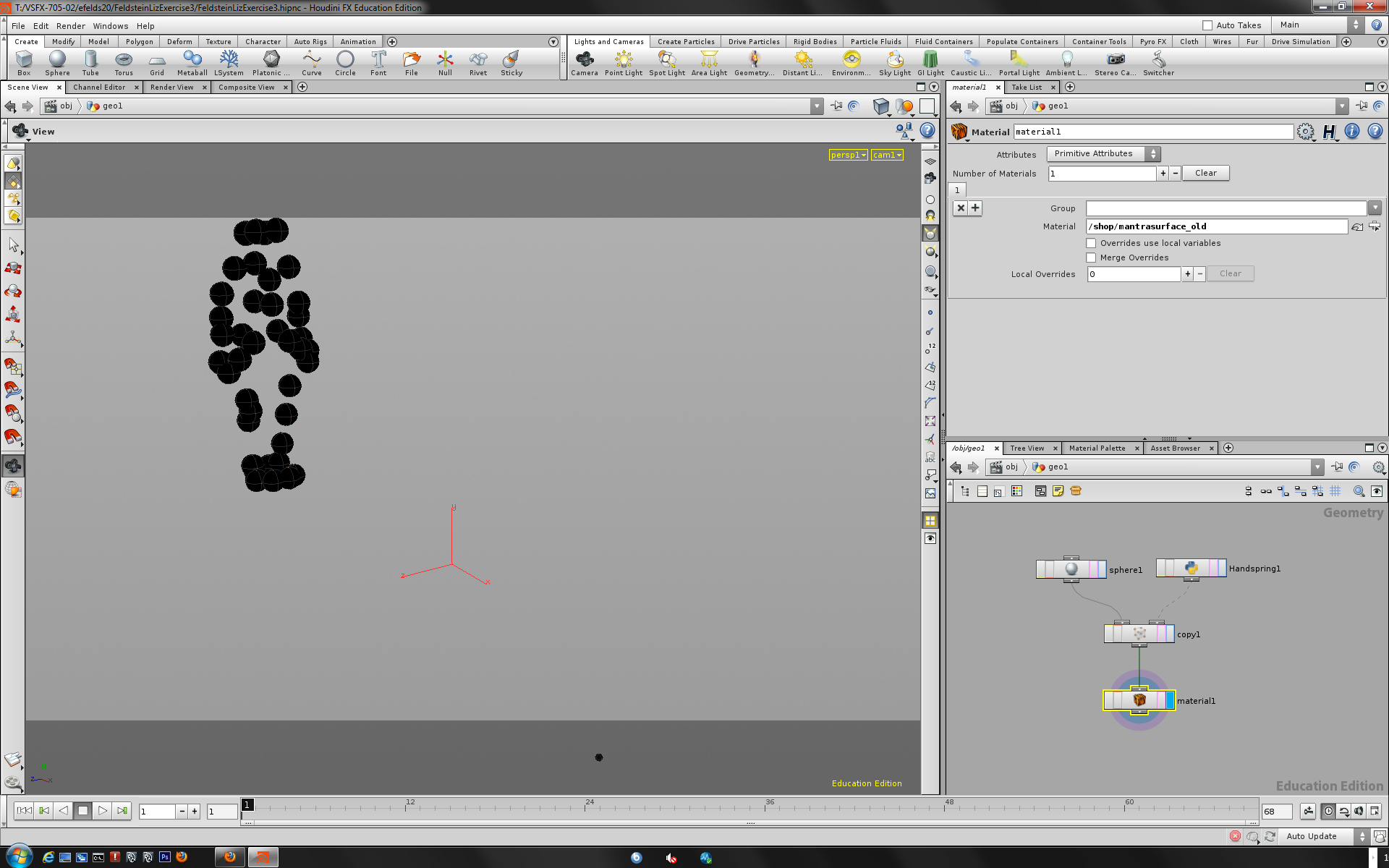 To make the motion capture “sphere-man” more aesthetically pleasing, I applied a Mantra Surface Shader to the spheres by connecting the material’s node to the copy node, as shown above. I changed the shader type to a Blinn so it would have reflective qualities, and made it appear pearlescent by changing its base color and adjusting the diffuse intensity, reflections, refractions, and a few other attributes.
