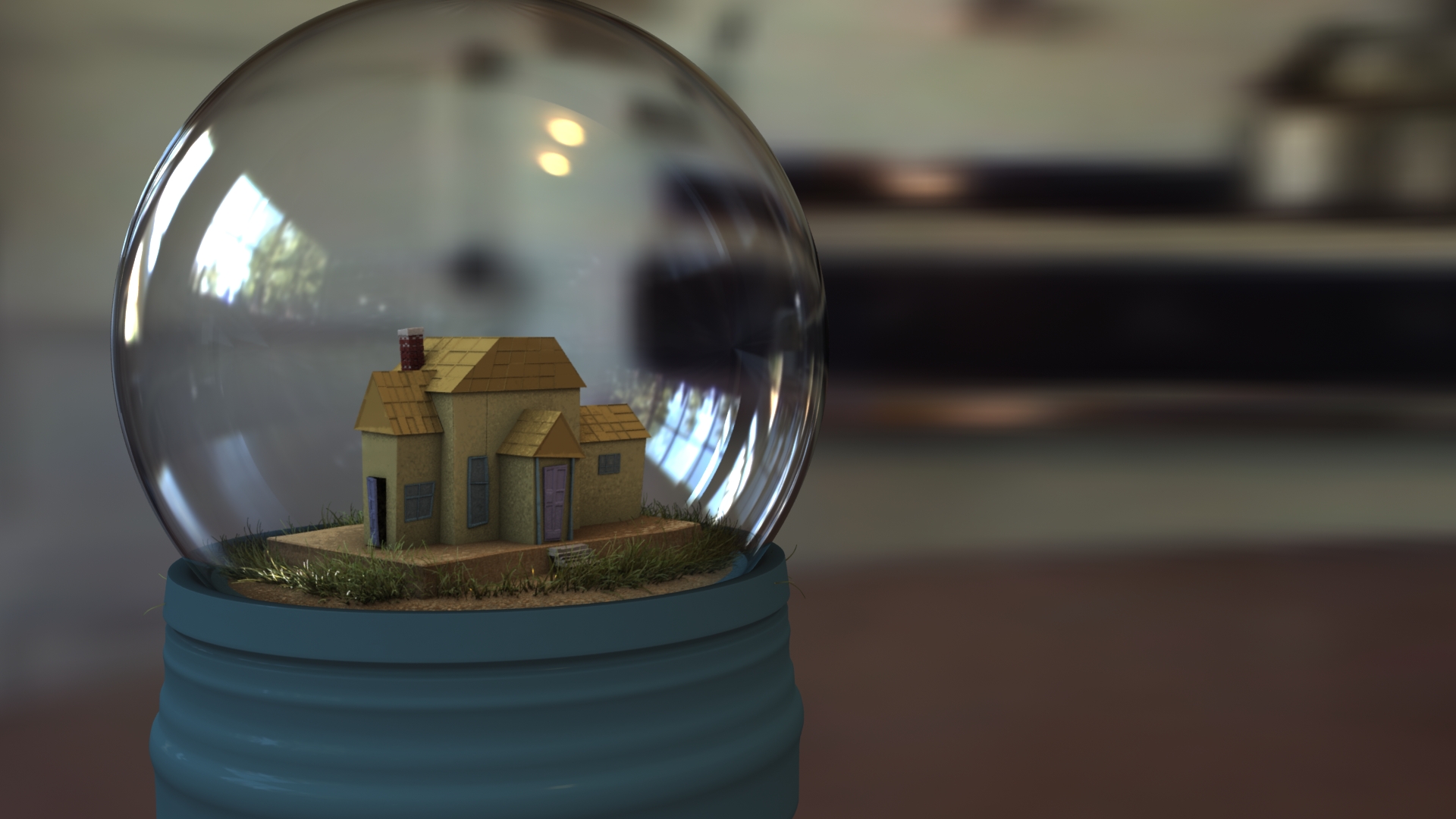 A closeup of the inside of the snow globe. The speckled effect on the house is unintentional, and is most likely a result of a rendering issue that pertains to the glass. Though I experimented with various Environment Light settings and different samples amounts, the effect still remains.